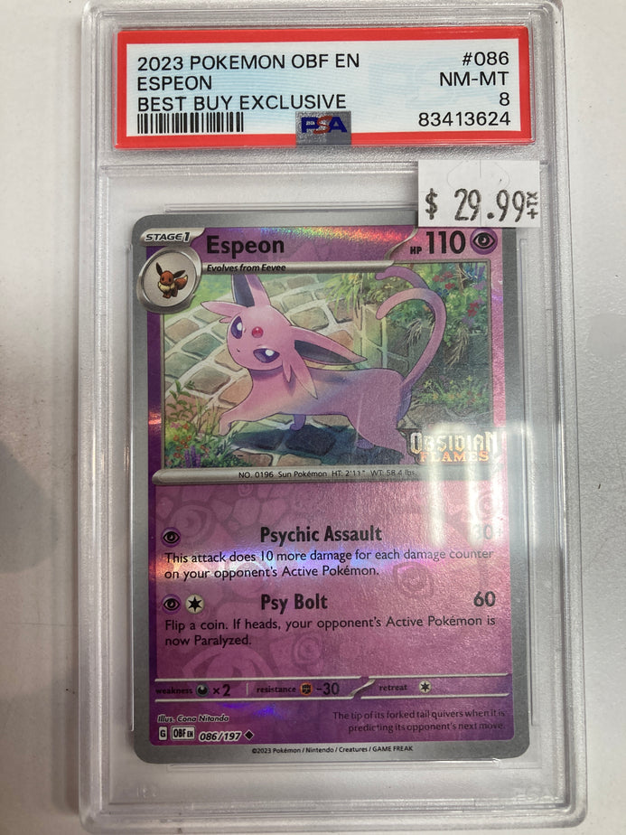 GRADED Pokémon TCG Espeon 086/197 Obsidian Flames Reverse Holo Stamp PSA 8